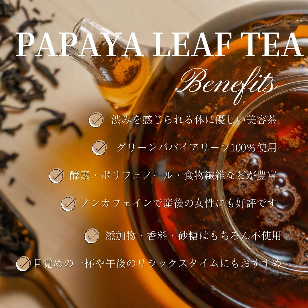 「お茶が好きでいろいろ試していますが、このお茶は特に気に入っています。最初は海外でグリーンパパイアの葉っぱのお茶の健康成分の高さを知りました。このお茶は、国産で安心できる作り手さんだったので、今では日々の習慣です。」