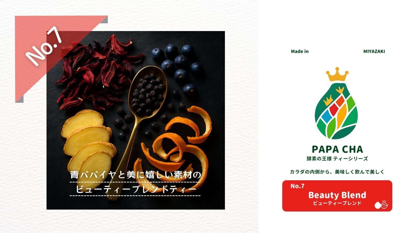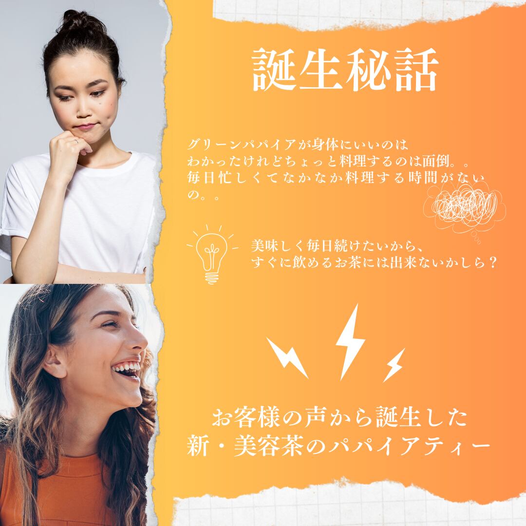 宮崎県産の青パパイヤ果実を100%使用したシリーズ原点の美容茶です。青パパイヤならではの自然な甘みと芳醇な香りが特長で、リラックスしたい時や就寝前にも安心して飲めるノンカフェインティーです。酵素やビタミンC、食物繊維など栄養もしっかり摂れるため、毎日の健康習慣として幅広い世代に支持されています。