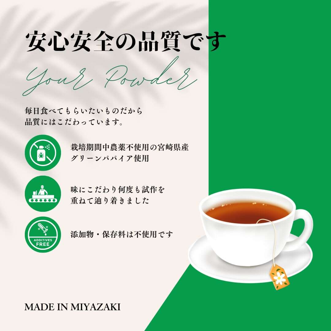 ✅なぜ宮崎県新富町産のグリーンパパイア葉なのか:宮崎県新富町は、自然豊かな環境で、農業が盛んな地域です。この地域で育てられるグリーンパパイア葉は、栄養価が高く、品質も非常に優れています。農薬を使わずに育てられるため、環境にも優しく、安心して消費者に提供できます。この地域特有の気候と土壌が、グリーンパパイア葉の栄養価をさらに高め、他にはない風味と香りを生み出しています。